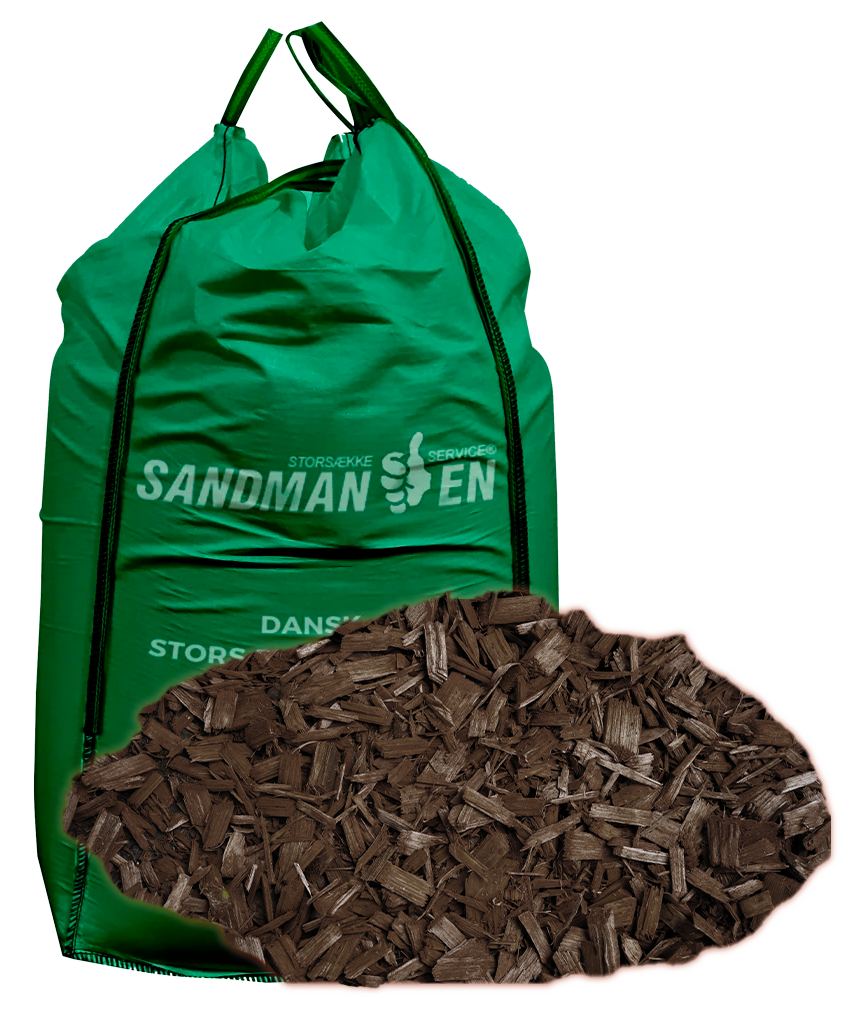 Vælg big-bag med 1 m3, 2 m3 eller 3 m3 MOSE-EG Colortræflis® sort er indfarvet træflis fra fyr/gran.