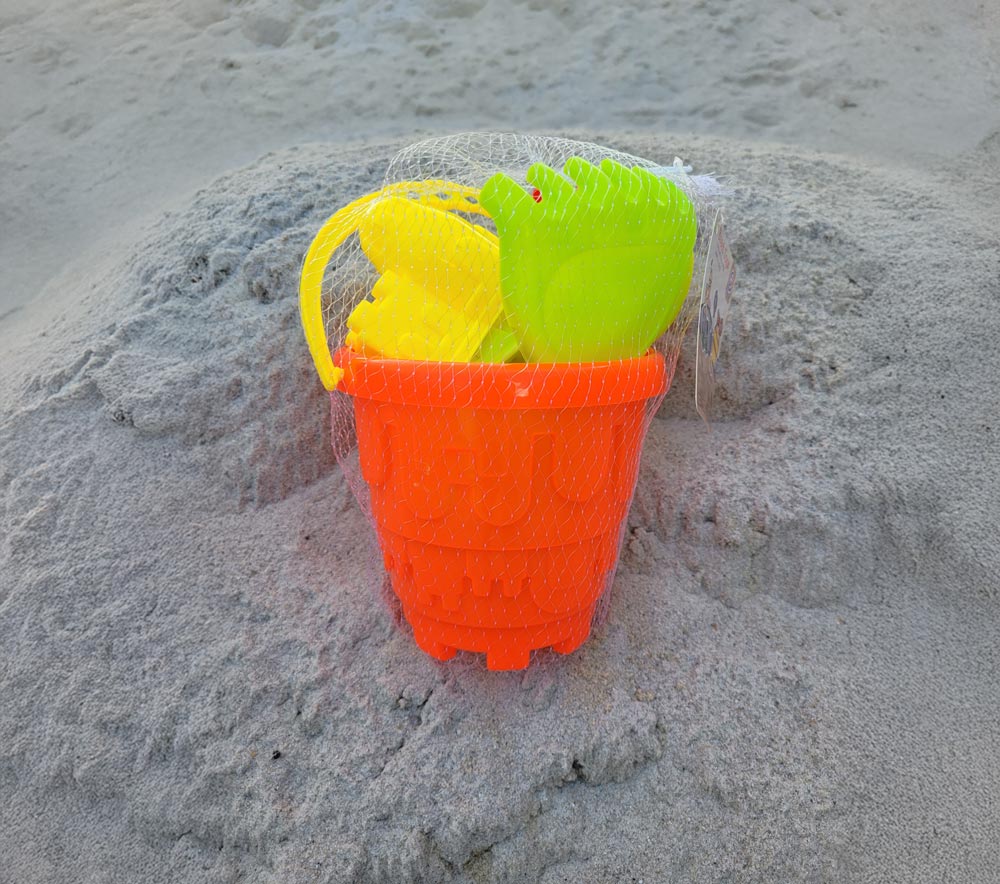 Dette farverige sæt indeholder spand, forme, rive, skovl, si og vandkande
